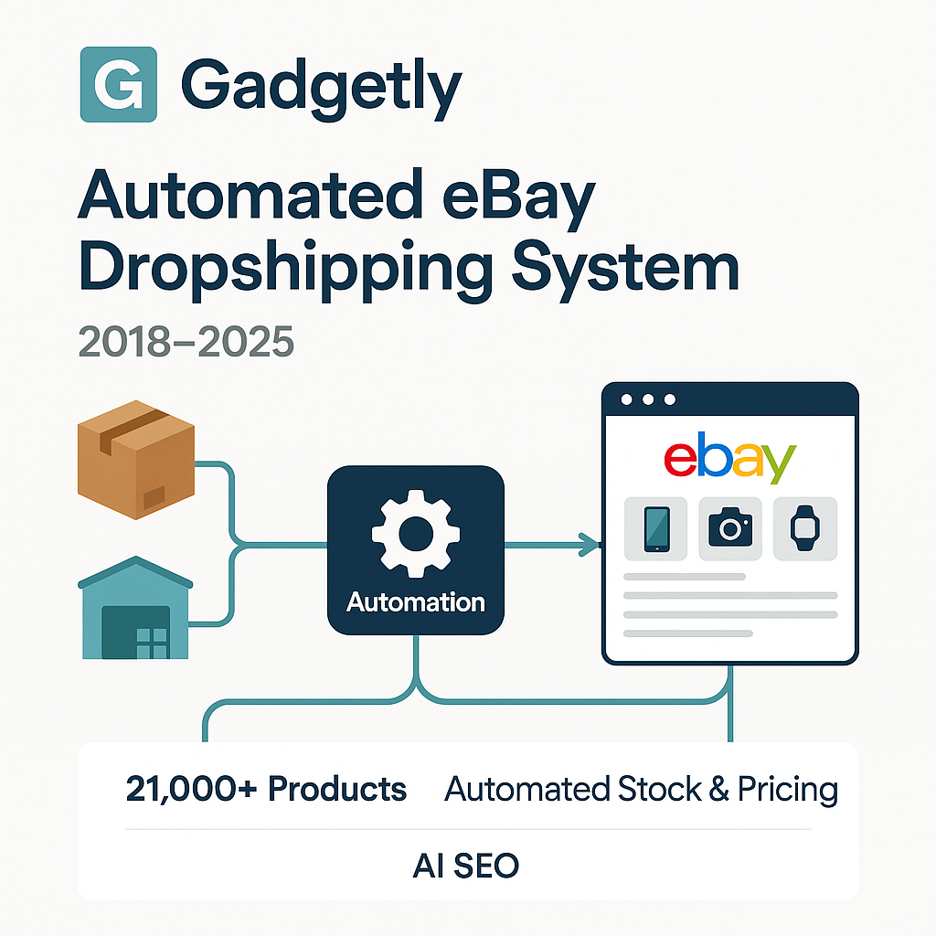 I developed a fully automated eBay dropshipping system that powered my store, Gadgetly, for several years. The system managed tens of thousands of products at scale, keeping listings accurate, competitive, and profitable with minimal manual work.